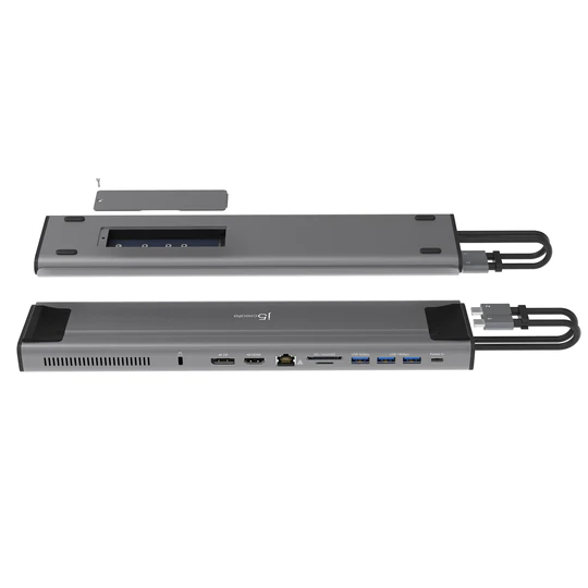 J5Create Create JCD552 dual display 12-in-1 docking station with M.2 slot ( NVMe or SATA ) – USB3 Type-C ( Gen2/10GBPs ) universal docking station – power delivery 100W pass-through , with 4K HDMi ( upto 3840×2160@60Hz ) + 4K DisplayPort ( upto 3840×2160@60Hz ) + gigabit lan + 1x USB3 Type-A ( Gen1/5GBPs ) + 2x USB3 Type-A ( Gen2/10GBPs ) + 2x USB3.0 Type-C ( Gen2/10GBPs ) downstream hub with fast charge port , 318x80x26mm slim size ; for windows or MACbook Pro / MACbook Air ( dual Type-C connectors )